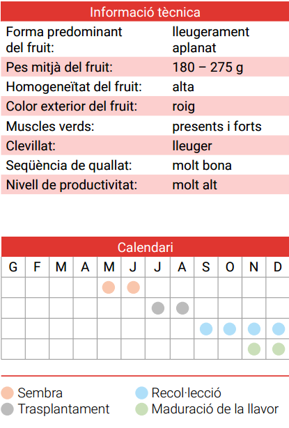 Planta vigorosa i amb bon fullatge. Aquesta varietat presenta unes costelles característiques i també muscles d’un verd intens –en estiu, de vegades, d’un taronja groguenc–, que es mantenen fins i tot en plena maduració. Pot presentar clevills amb intensitat variable depenent de l’època de maduració. Una característica molt interessant d’aquesta varietat és la bona seqüència de quallat i, per tant, el molt bon nivell productiu. Més adequada per a cultiu de tardor-hivern.
